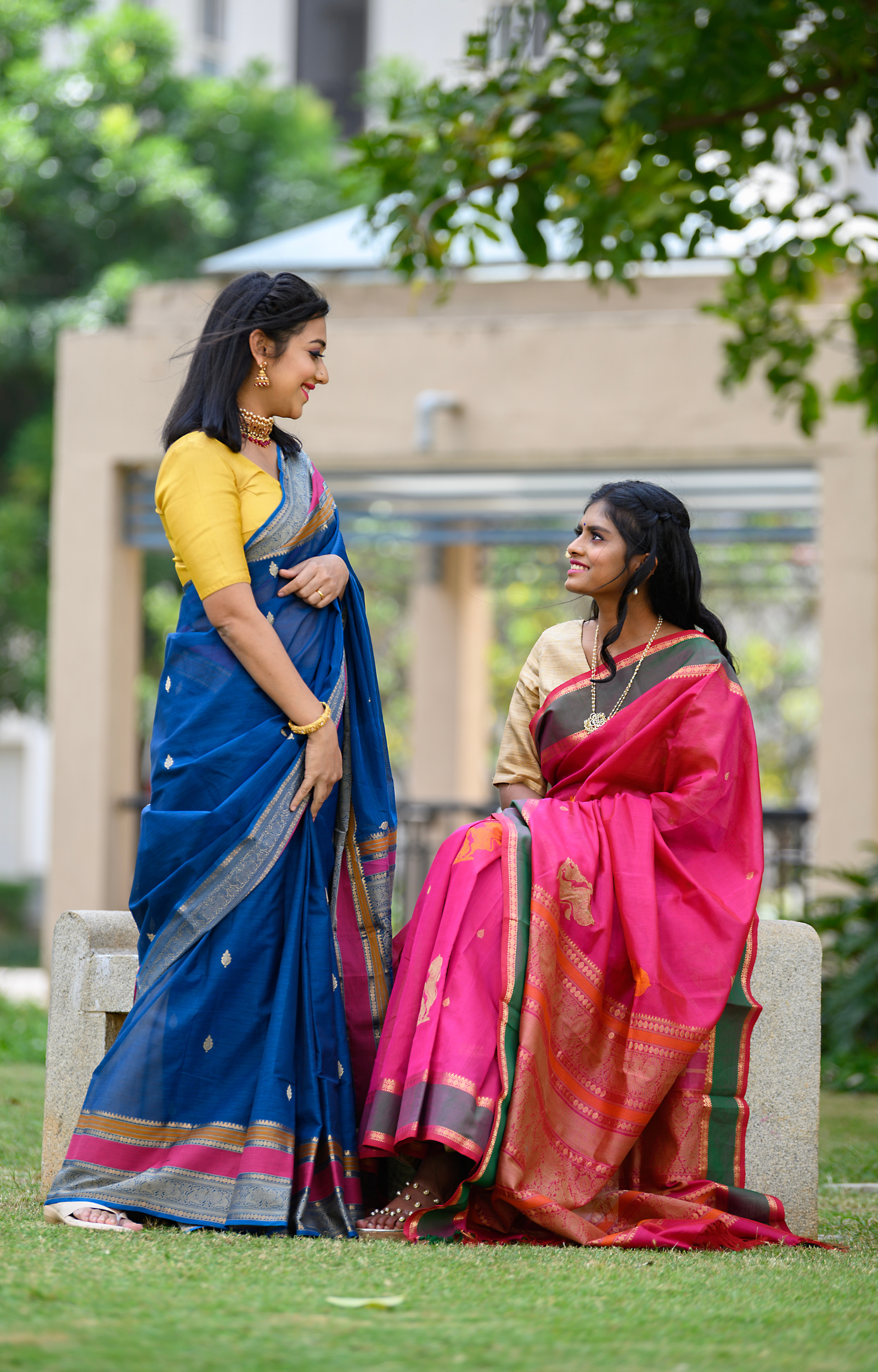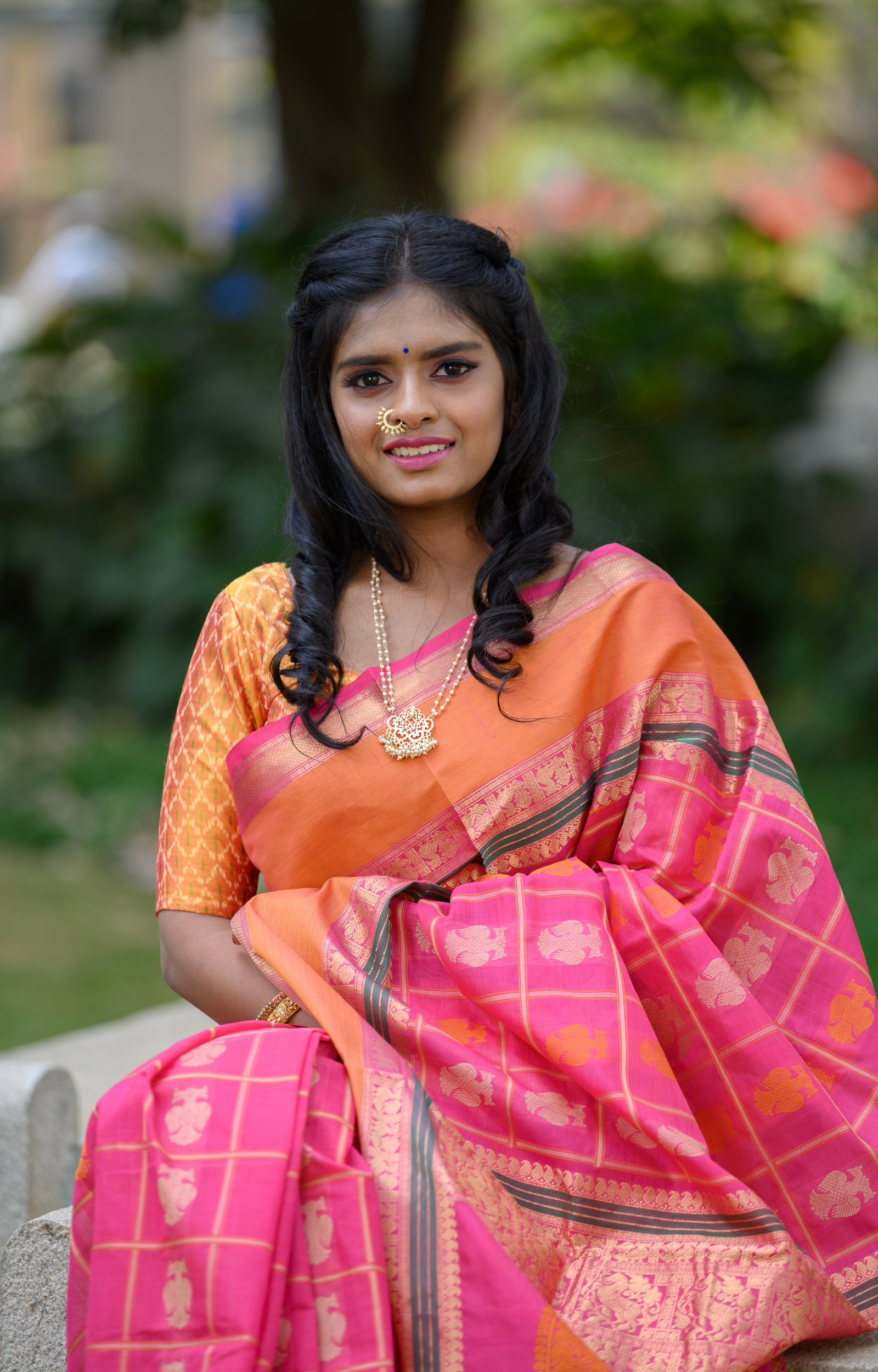 Looking for authentic Kanchipuram silk sarees online? Sil-Kan-Chic offers a stunning collection of handcrafted sarees made from pure mulberry silk. Each saree is painstakingly hand dyed and handwoven by skilled craftspeople, ensuring the highest quality and attention to detail. Plus, our jari (metallic thread) is of the highest quality, adding an extra touch of elegance to every saree. Shop now and add a timeless piece to your wardrobe!