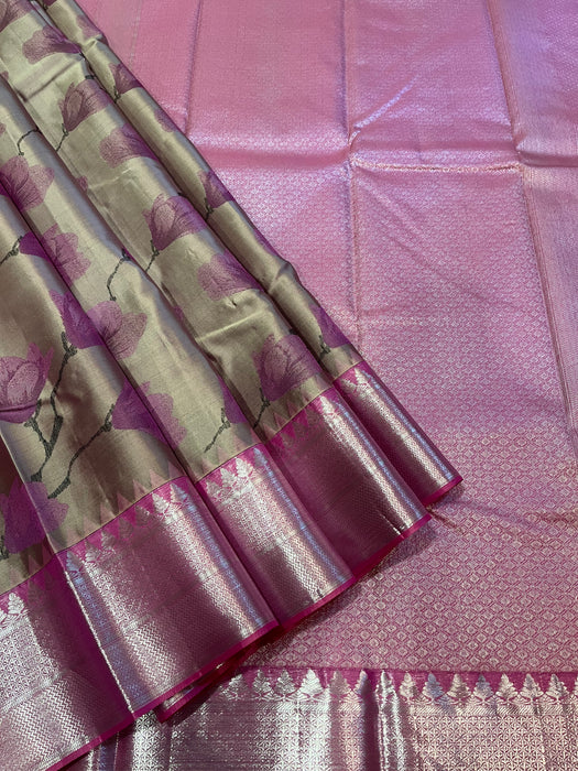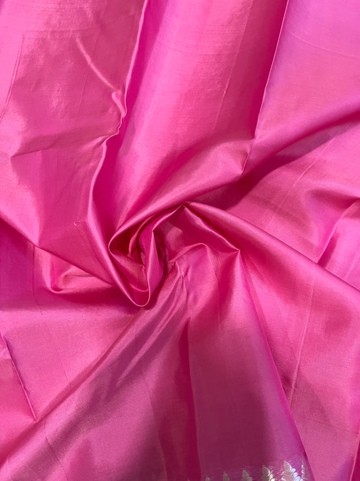 Rich Silver Zari Long and Short on Pink Border Kanchipuram Silk Saree