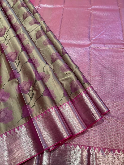 | Saree Colour | All over pink magnolias against light copper tissue backdrop |
