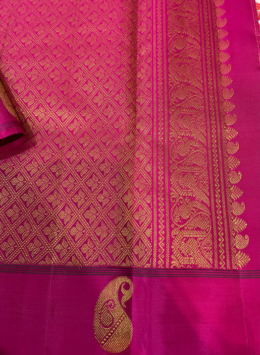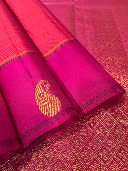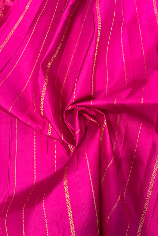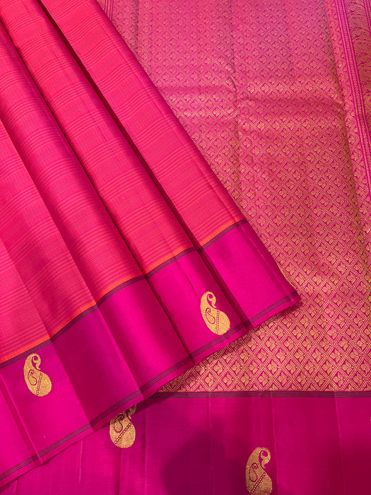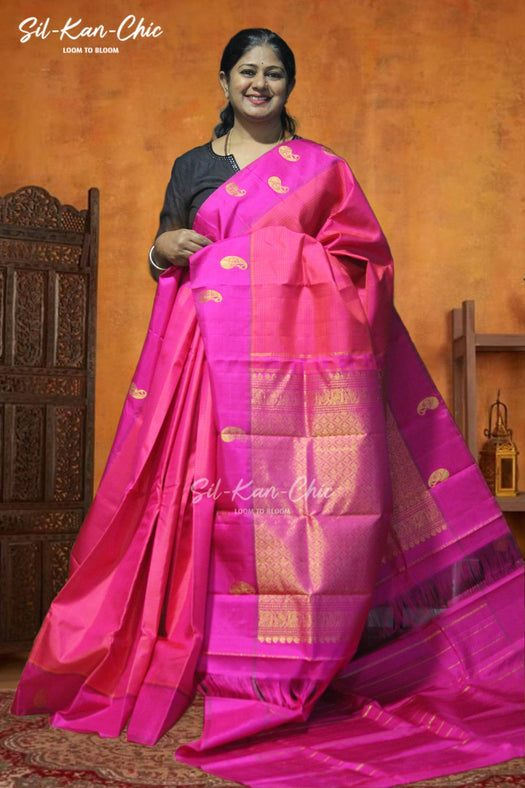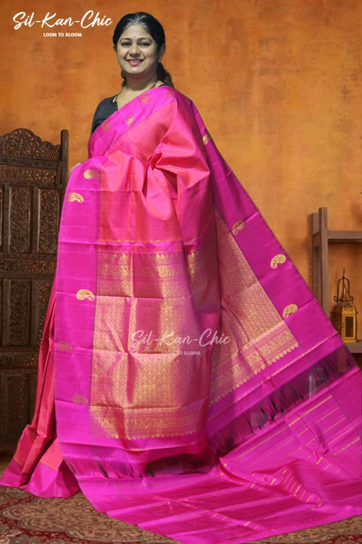 Expertly crafted from fine Kanchipuram silk, this pink saree is a timeless beauty. Its luxurious material and intricate detailing will elevate any occasion. Made to last, this saree is a must-have for any wardrobe.