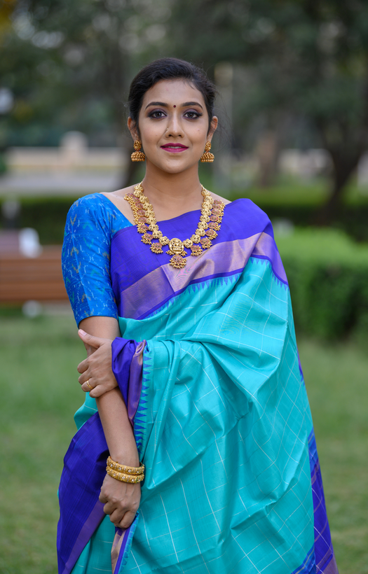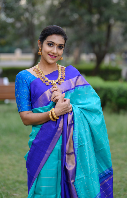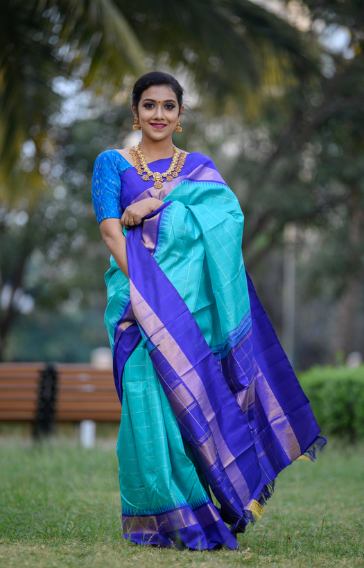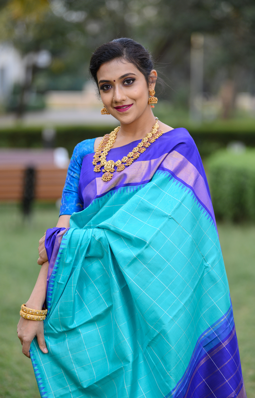 Purple Border with Gold Zari Band Teal with Silver Kanchipuram Silk Saree