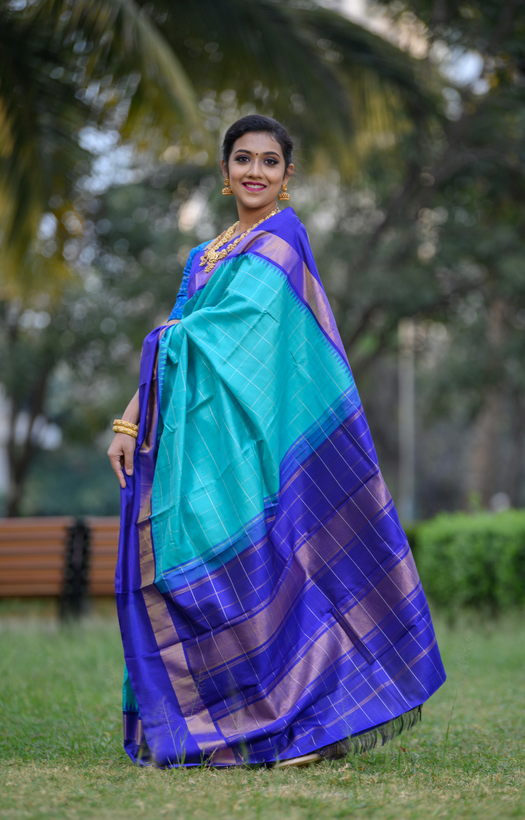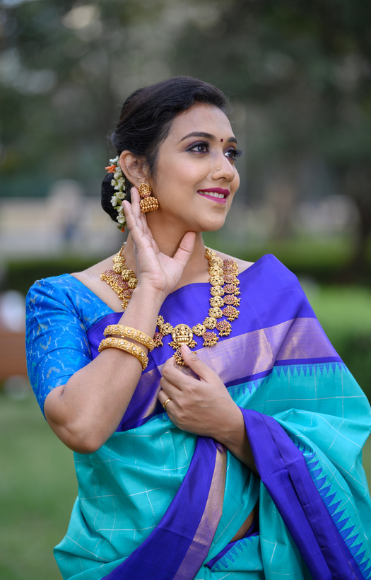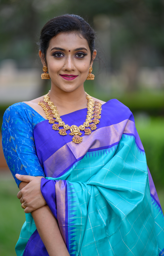| Saree Colour | teal with silver zari kattam |