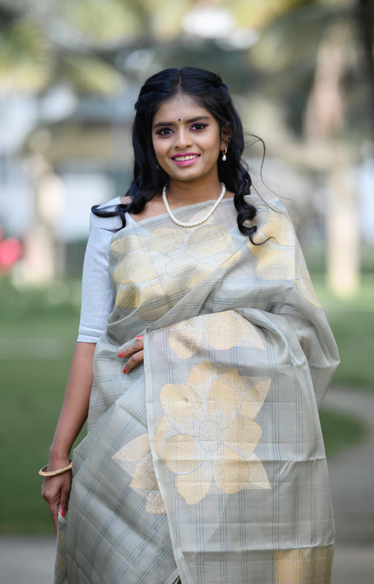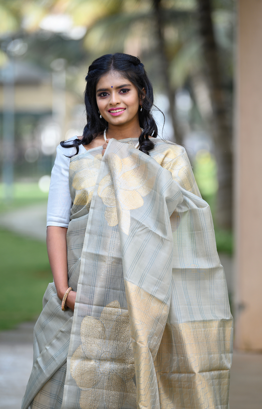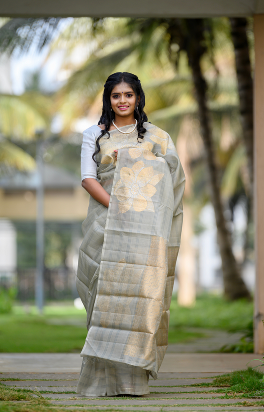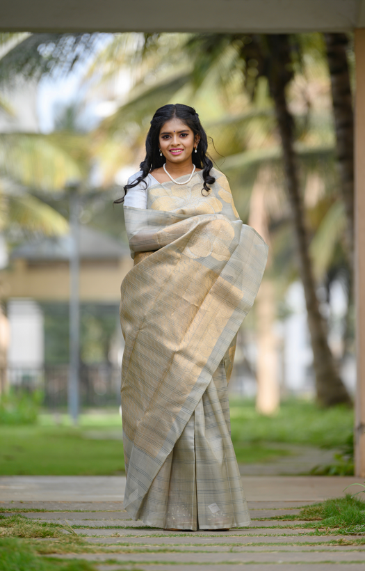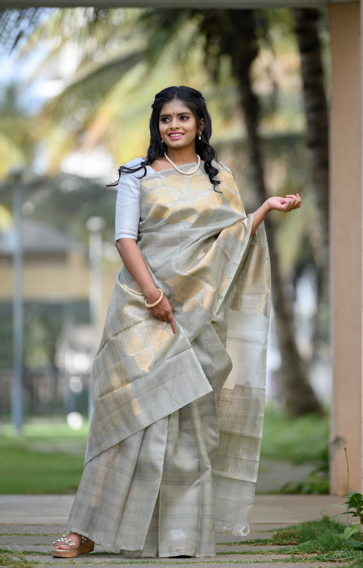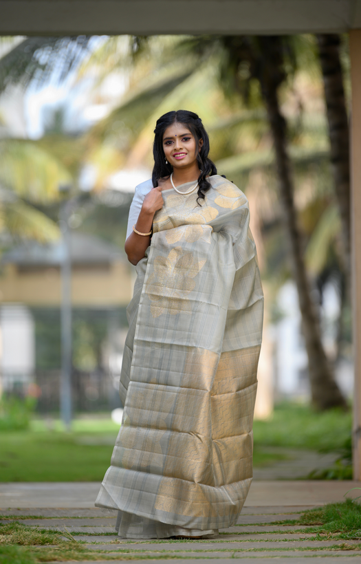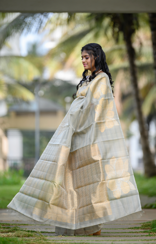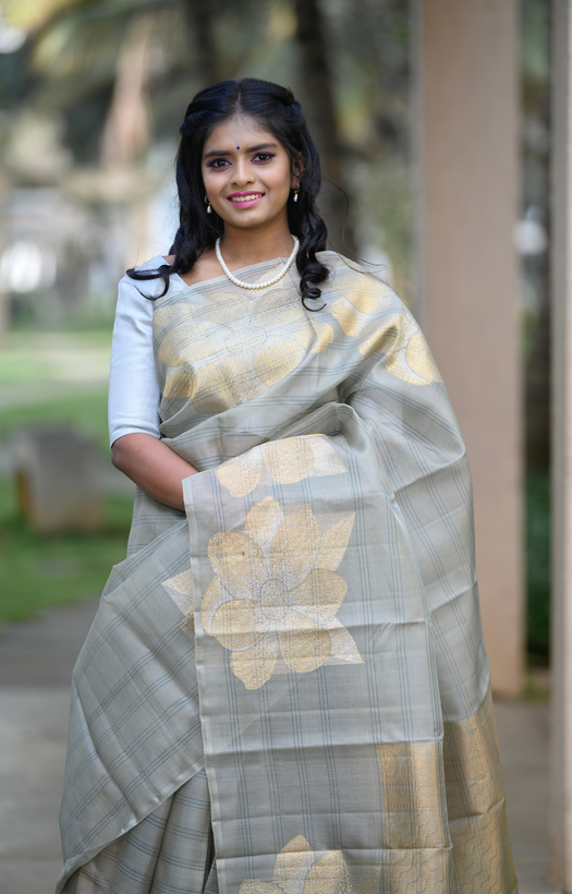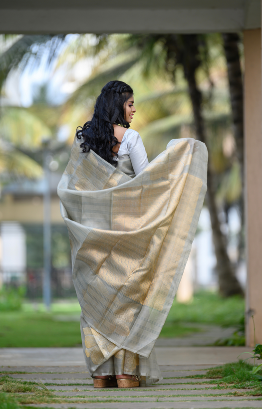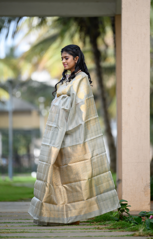 Grey color body with all over horizontal lines. Borders with big flower Silver & Gold jari butta.