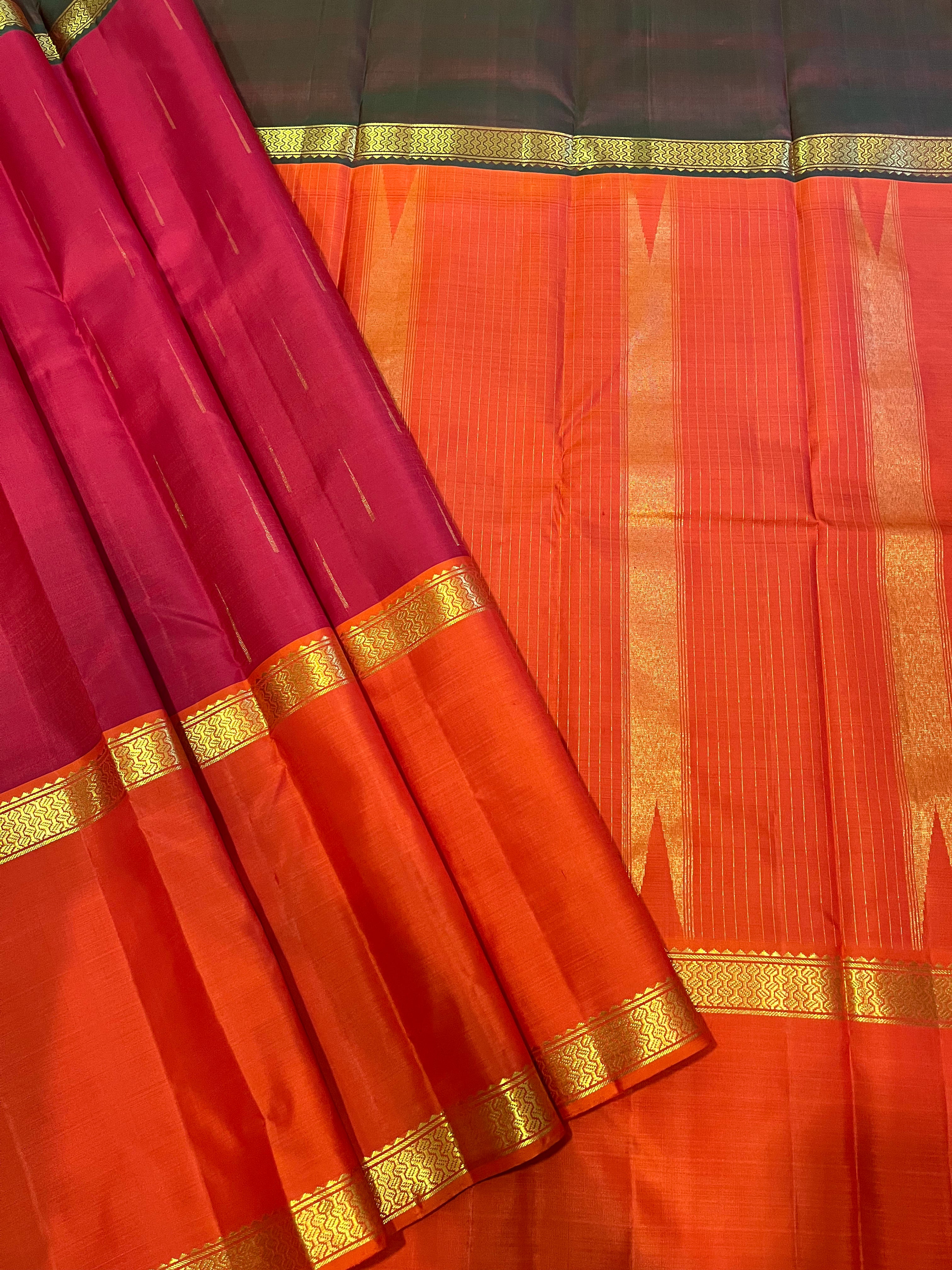 Pink and Rust Orange Retapet Both Sides Border with Tazhampoo Design Peacock Blue Kanchipuram Silk Saree