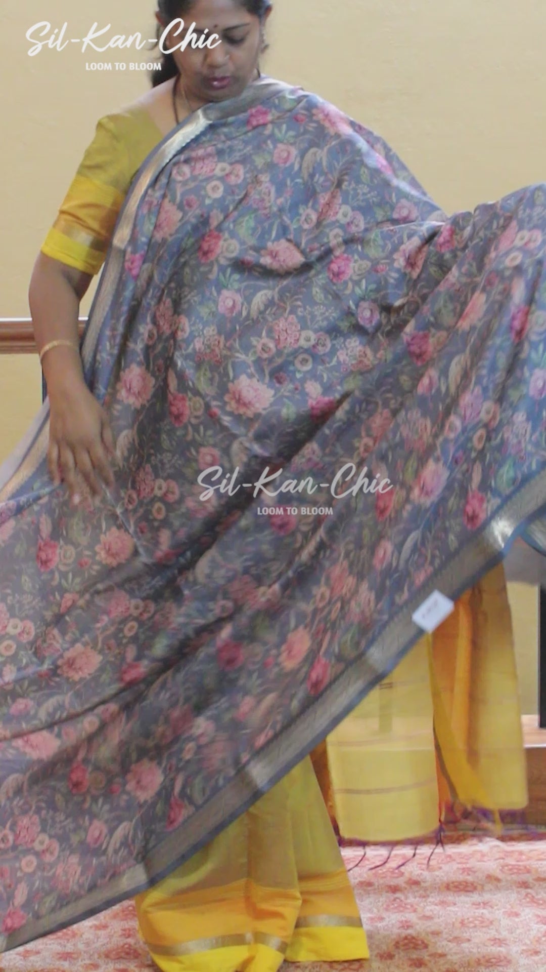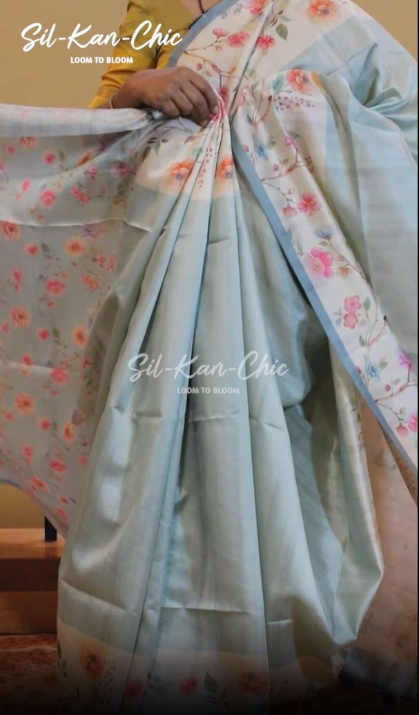 Sky Blue Saree With Floral Prints On Saree And Pallu And Zari Border On Either Sides Self Colour Floral Print Blouse