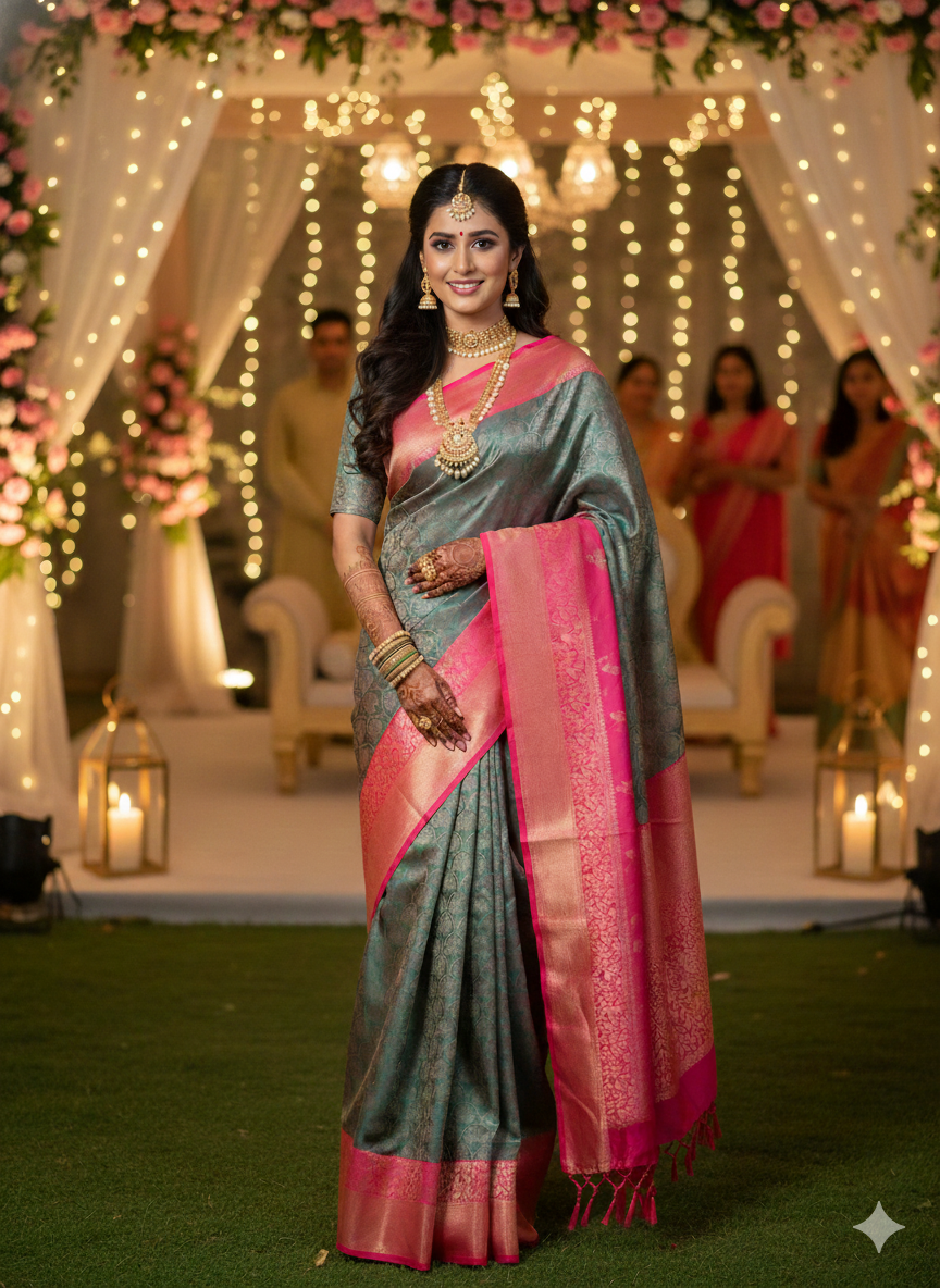 Pink Roses Both Sides on Green Tissue Backdrop Kanjivaram Silk Saree