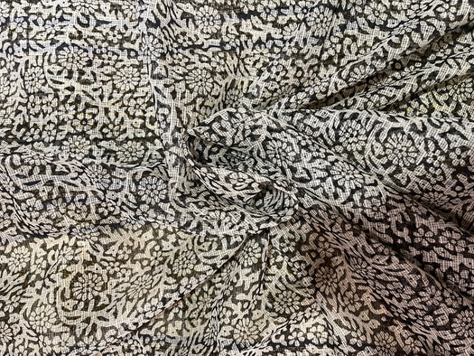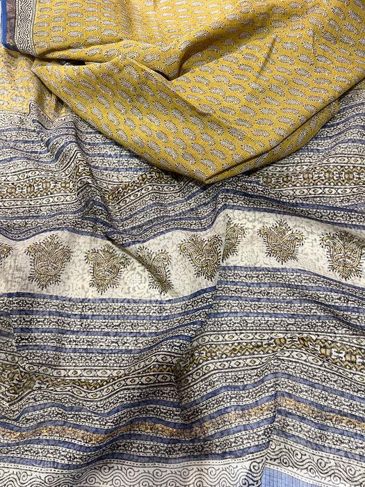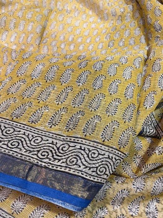 Design Yellow kota saree with white paisleys and double border with blue selvage. |