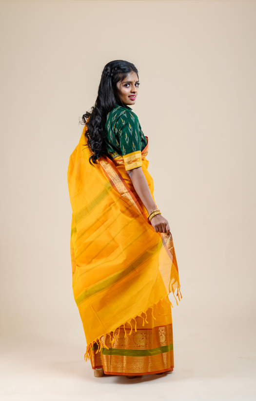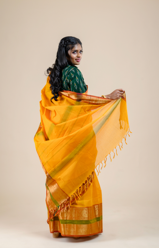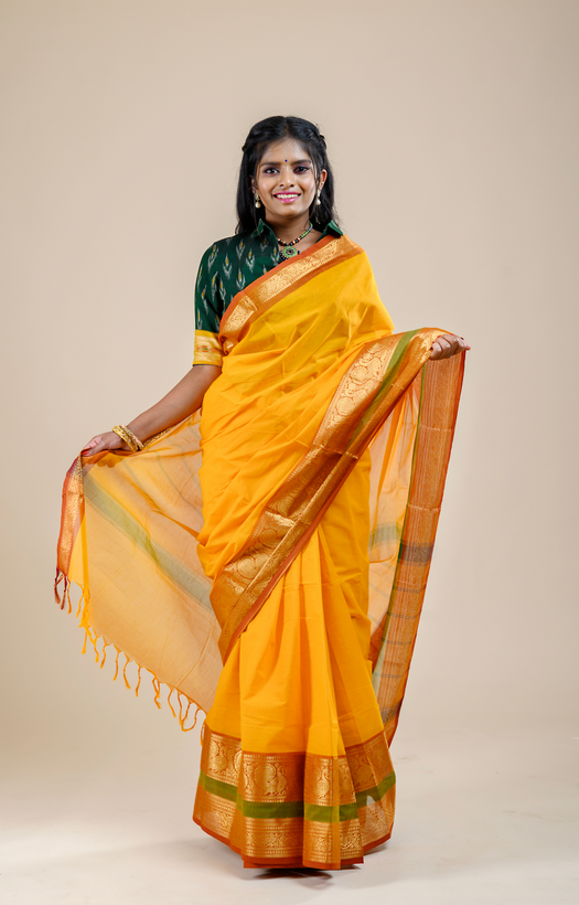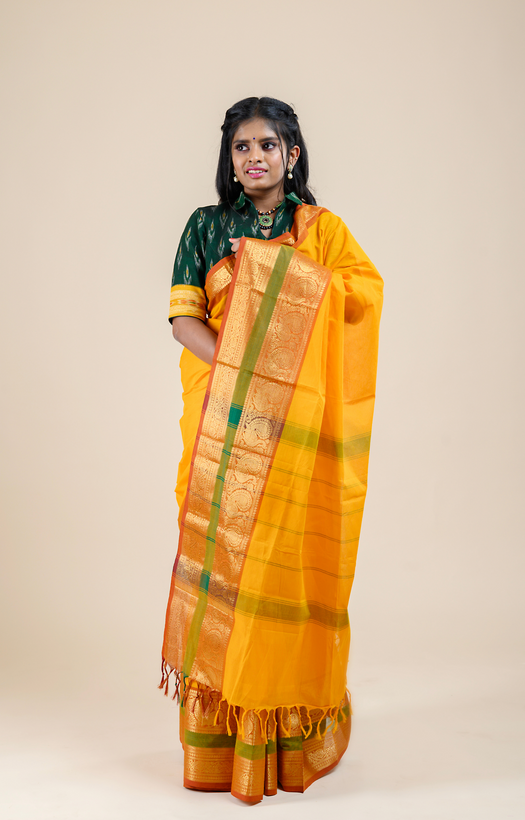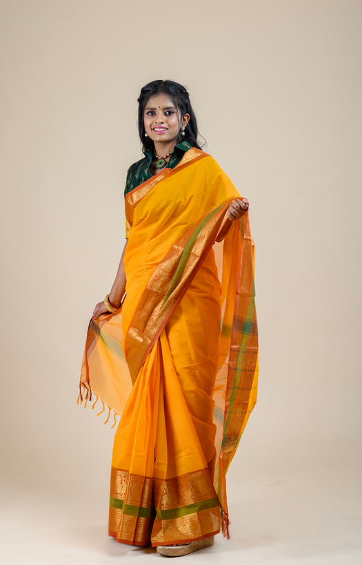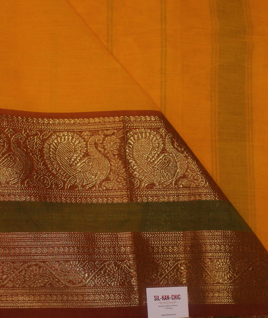 Design Orange body with 3 inches short and 7 inches long border. Border features Annam and Floral motifs woven with jari. |