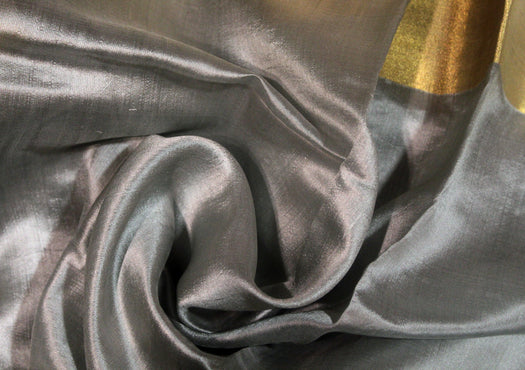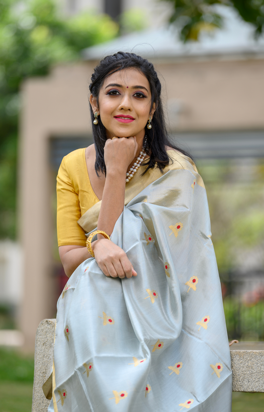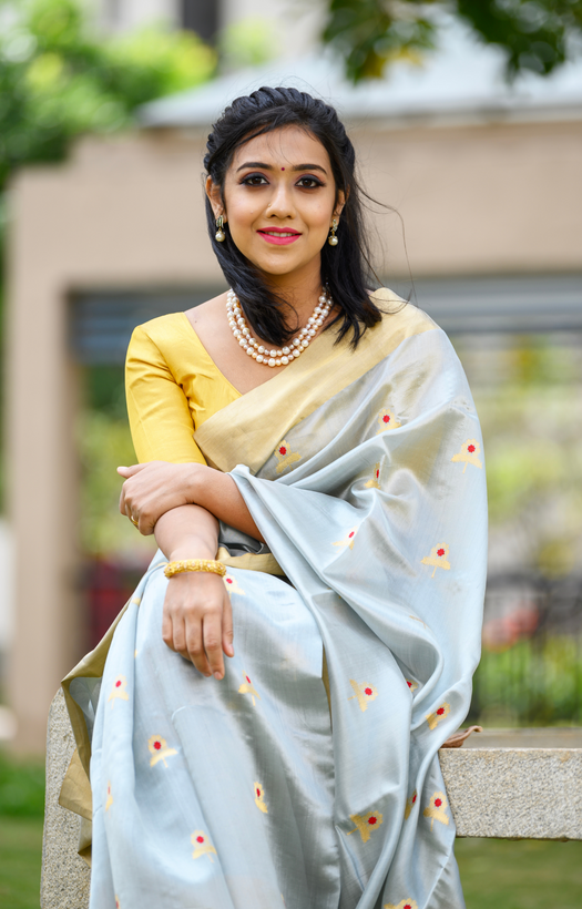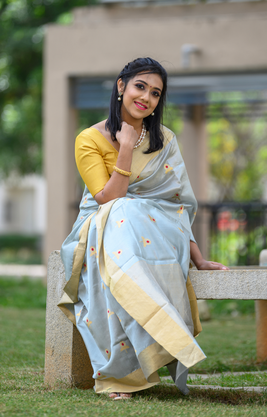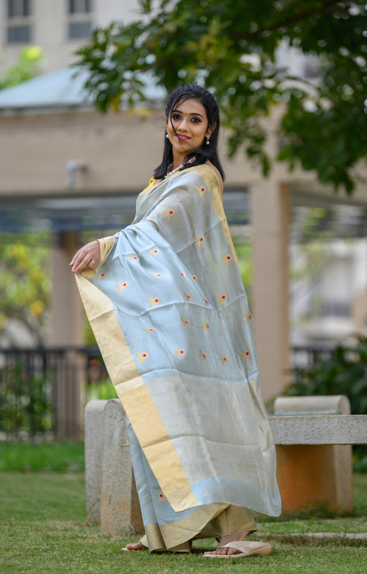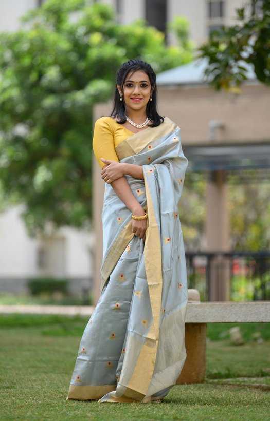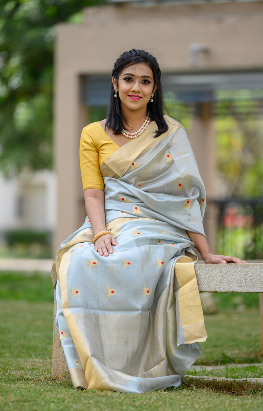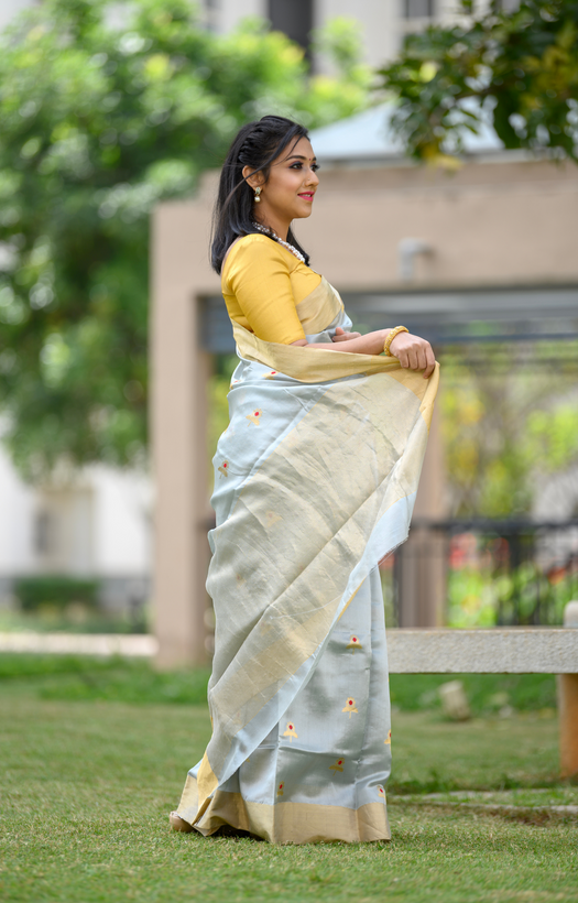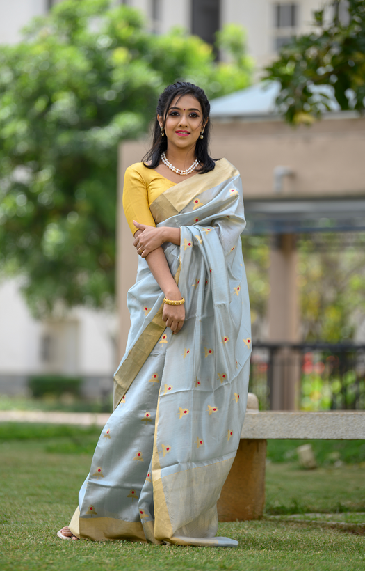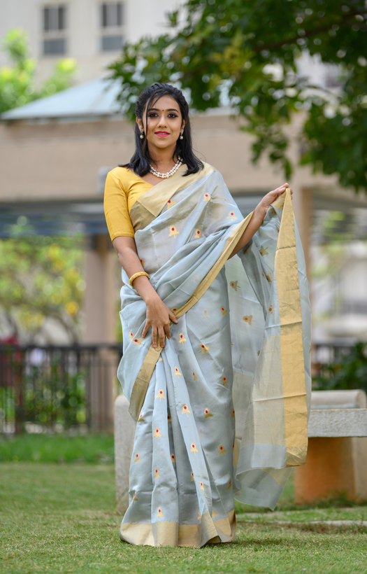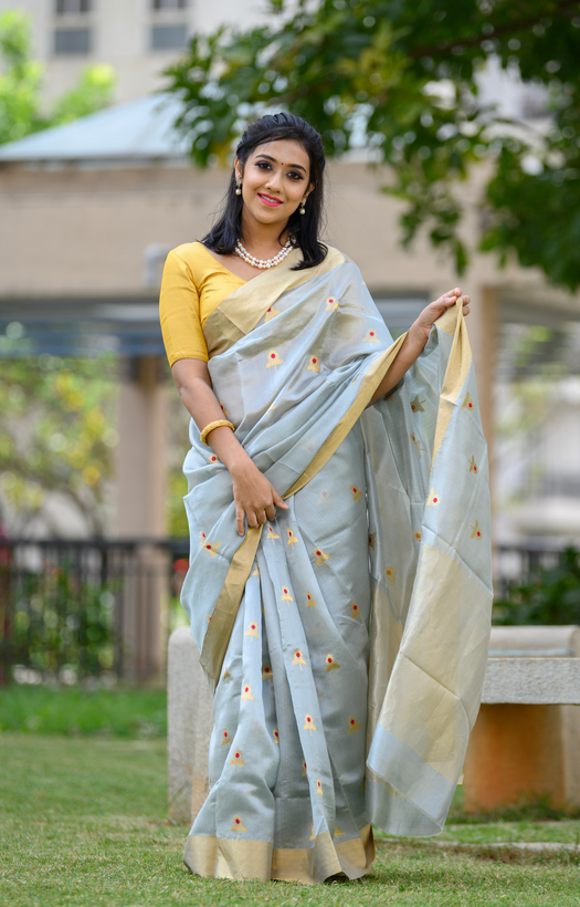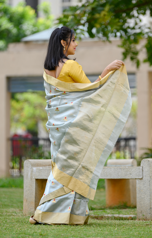 Design Pastel grey silk saree with gold jari flower motifs. 4 inches plain gold jari border. |