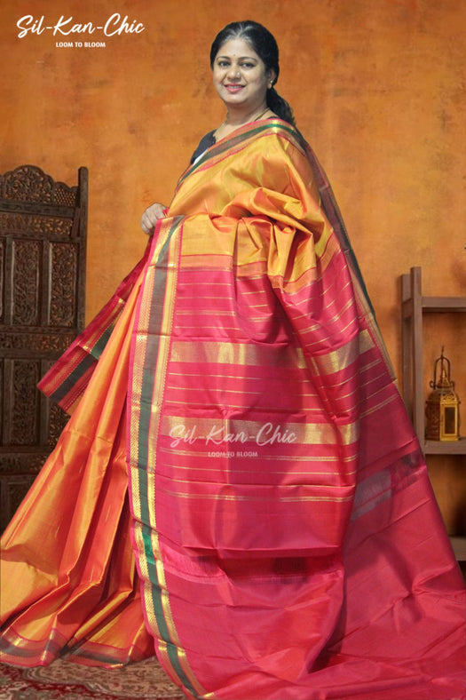 Expertly crafted with rust orange Kanchipuram silk, this saree boasts a vibrant body with intricate raindrop zari butta designs. The green retapet border and red selvage add elegance to the piece, while the red pallu with muthuseera zari lines exudes opulence. Comes with a contrasting red blouse.